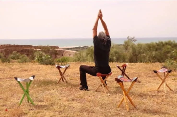 Sur la plage, face à l’océan, un coach local nous guidait dans des séances d’étirements et d’échauffements sur un simple tabouret — le fameux Tabouret Yoguiste++.